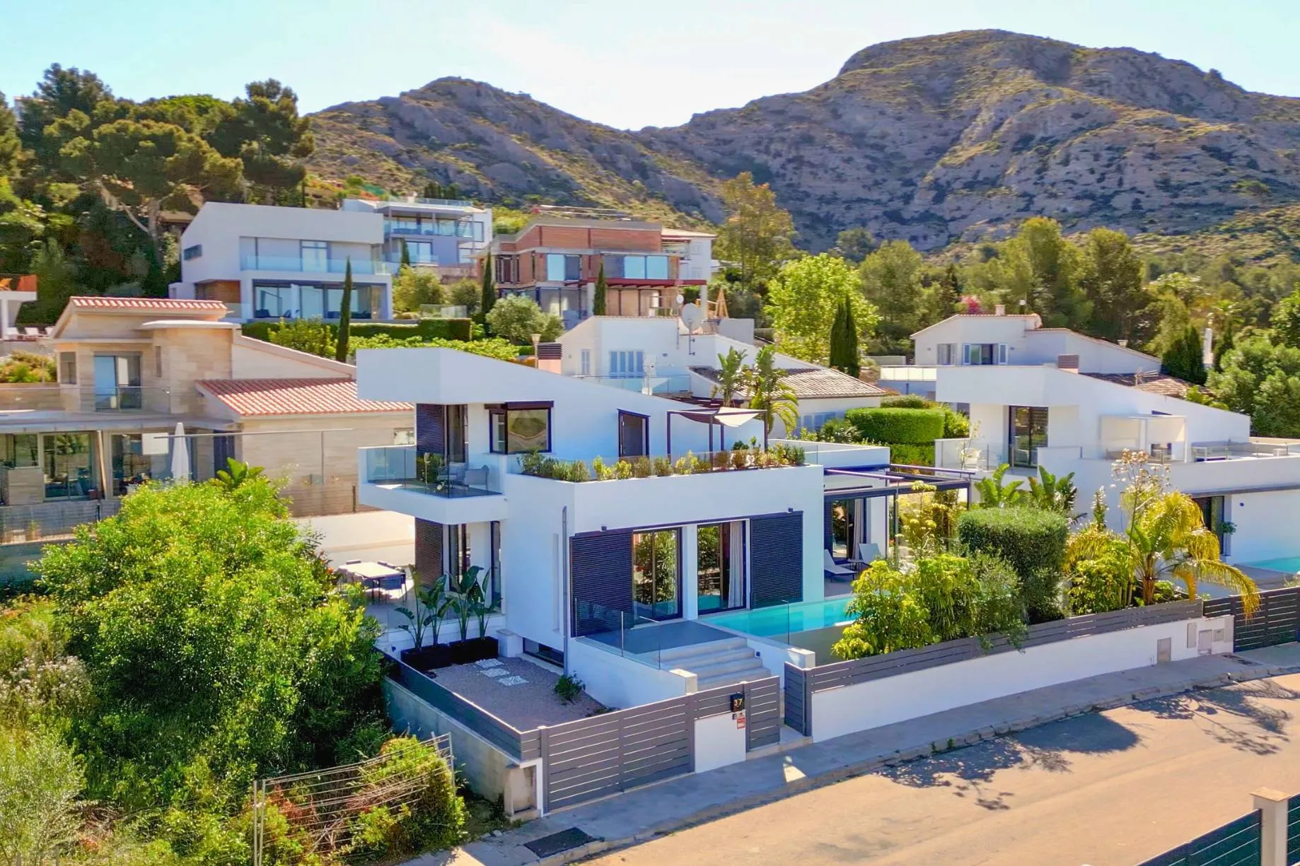 Den Mittelpunkt der modernen Villa bildet ein heller Wohn- und Essbereich mit offener Küche. Bodentiefe Fenstertüren führen zur Terrasse mit Infinity-Pool und Sonnenliegen. Eine weitere Terrasse ist von der Küche aus zugänglich und bietet mit Grill und Essbereich die ideale Location, um die warmen Sommerabende zu genießen und ein perfektes Inside-Out-Living-Erlebnis zu ermöglichen. Ein weiteres Highlight ist die Dachterrasse mit Panoramablick auf die Berge und das Meer. Ein Wellness- und Fitnessbereich mit Sauna sowie ein Heimkino/Games Room vervollständigen den Urlaubskomfort.