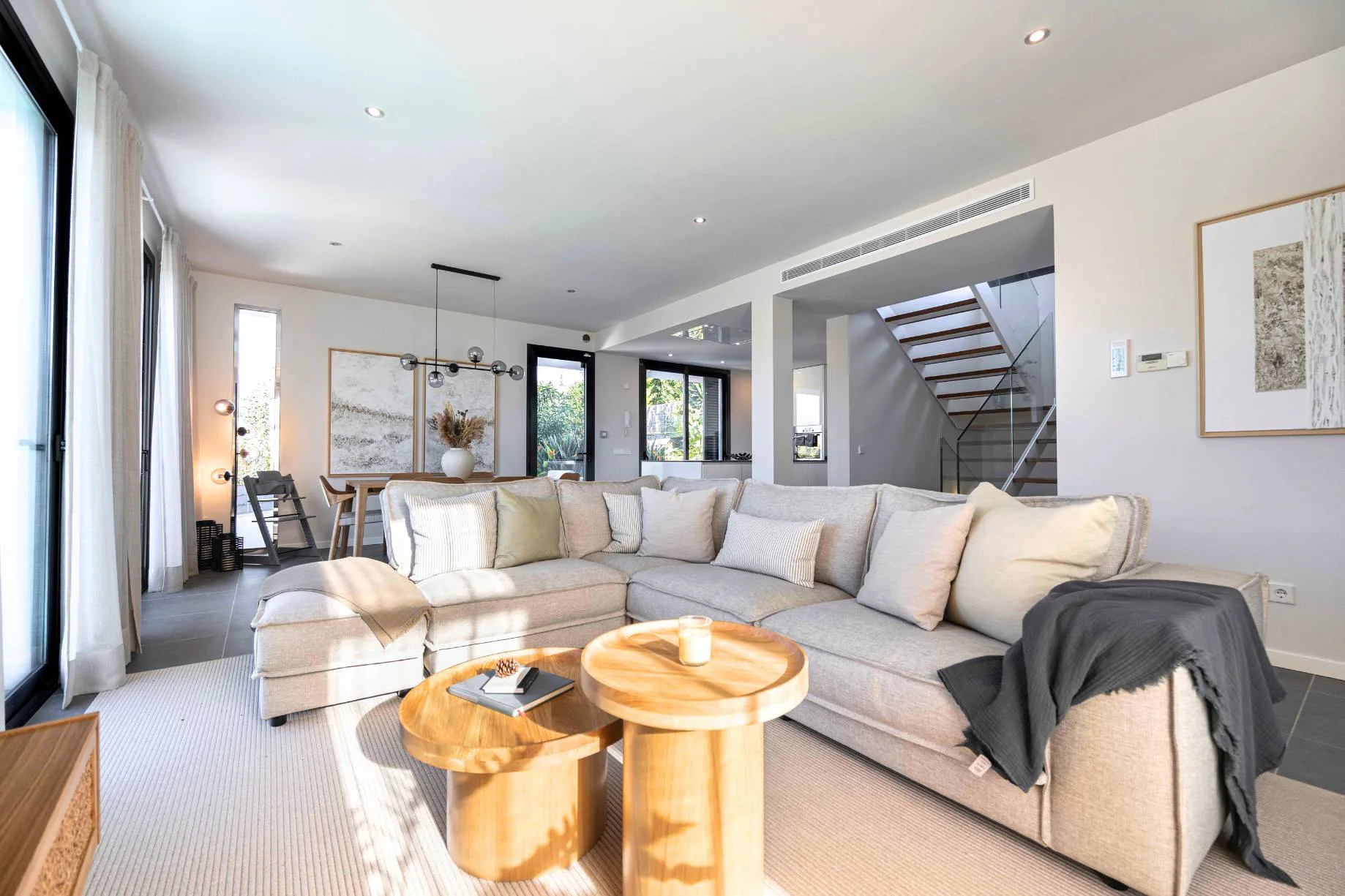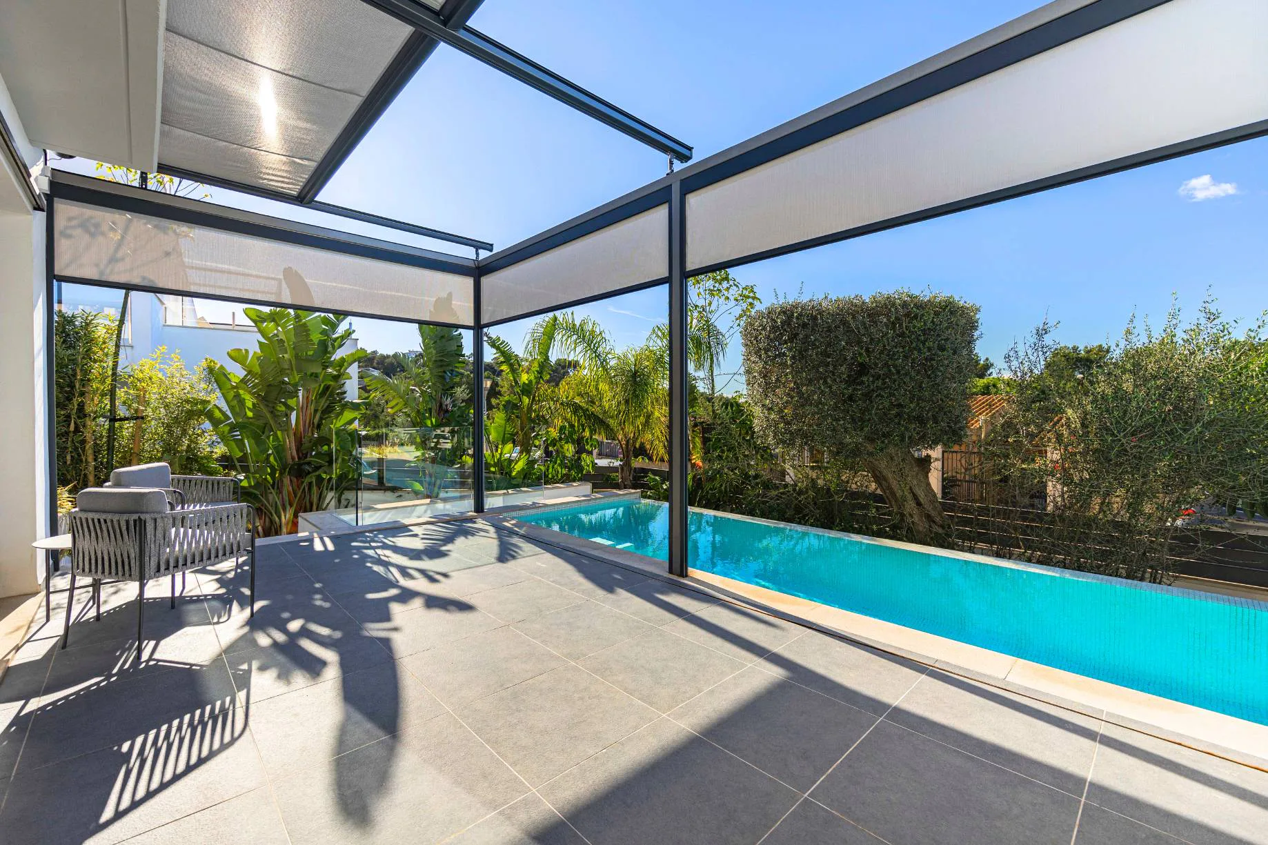 Den Mittelpunkt der modernen Villa bildet ein heller Wohn- und Essbereich mit offener Küche. Bodentiefe Fenstertüren führen zur Terrasse mit Infinity-Pool und Sonnenliegen. Eine weitere Terrasse ist von der Küche aus zugänglich und bietet mit Grill und Essbereich die ideale Location, um die warmen Sommerabende zu genießen und ein perfektes Inside-Out-Living-Erlebnis zu ermöglichen. Ein weiteres Highlight ist die Dachterrasse mit Panoramablick auf die Berge und das Meer. Ein Wellness- und Fitnessbereich mit Sauna sowie ein Heimkino/Games Room vervollständigen den Urlaubskomfort.