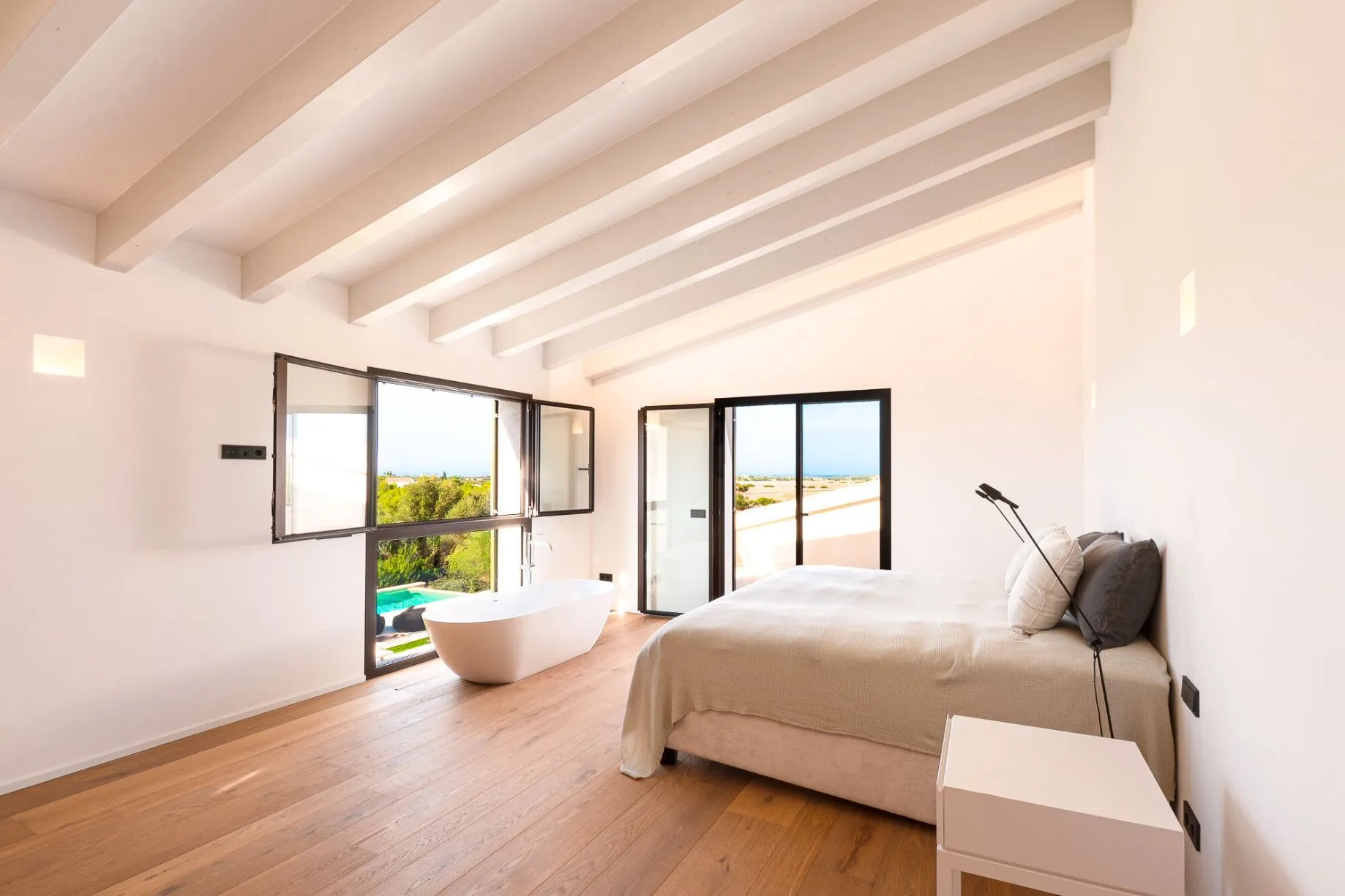 Diese exklusive Neubau-Finca im mediterranen Stil begeistert durch ihre Nähe zum traumhaften Es Trenc Strand, viel Privatsphäre, einem traumhaften Blick in die Natur sowie sämtlichen erstklassigen Annehmlichkeiten für umfassende Erholung. Insight-out Living steht hier im Vordergrund - freuen Sie sich auf großzügige, teilweise überdachte Terrassenflächen mit Sonne von früh bis spät, einen gepflegten Garten mit großem Salzwasser-Pool sowie einer Außenküche für al fresco Dining. Hinzu kommen eine Außensauna sowie ein Fitnessbereich. Im Innenbereich überzeugt die großzügige Raumgestaltung mit hohen Decken, viel natürlichem Licht dank großer, bodentiefer Fensterflächen, sowie ein Kamin im Wohnzimmer für zusätzliche Gemütlichkeit. Das Master-Schlafzimmer verfügt über eine eigene Dachterrasse und eine freistehenden Badewanne, mit einem traumhaften Blick bis nach Ses Salines.