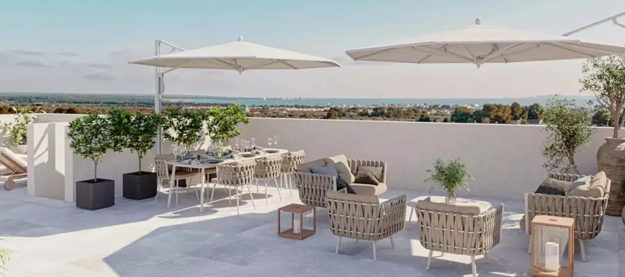 Dieses Neubau-Penthouse ist Teil einer exklusiven Anlage nahe der Küste von Sa Rapita und überzeugt mit einer großzügigen Dachterrasse mit Meerblick und Loungebereich für mediterranes Inside-out Living. »